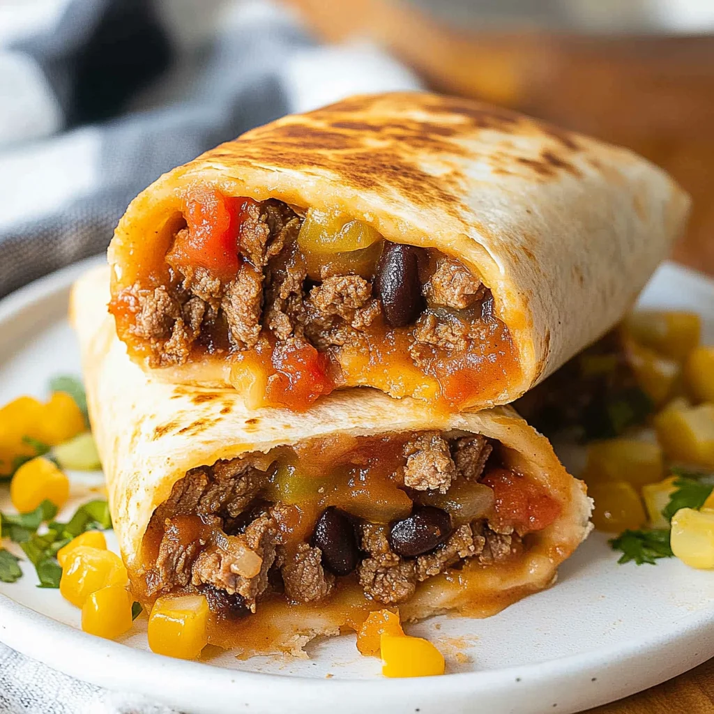 Delicious beef burritos filled with seasoned ground beef, beans, and fresh toppings, wrapped in a soft tortilla.
