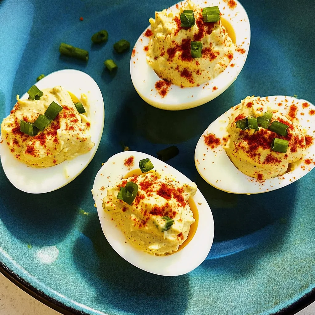 Bold flavors come alive in every bite with the unique Creole seasoning that elevates the classic deviled egg. Quick and easy, you can whip these up in just 25 minutes, making them perfect for any gathering. Versatile enough to impress guests at parties or simply enjoy as a snack, they are sure to be a hit! With a delightful zesty filling of mayonnaise, Dijon mustard, and hot sauce, these eggs add a spicy twist to your appetizer lineup. Plus, each egg is beautifully garnished with chopped pickles and paprika for that extra pop of flavor and color!
