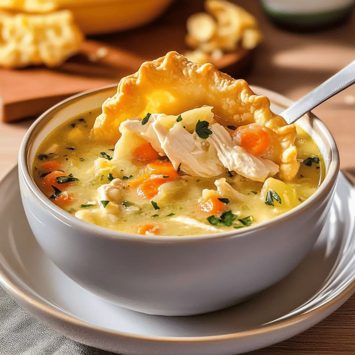 In conclusion, the Chicken Pot Pie Soup Recipe delivers all the comforting flavors of a classic chicken pot pie in a warm, inviting soup form. The rich broth, tender chicken, and vibrant vegetables combined with cheesy cheddar crust dippers offer a delightful contrast that will warm your heart and satisfy your appetite. This versatile recipe is easily customizable and perfect for any occasion, making it a must-try in your kitchen. Embrace the warmth and flavor of this delightful dish with friends and family!