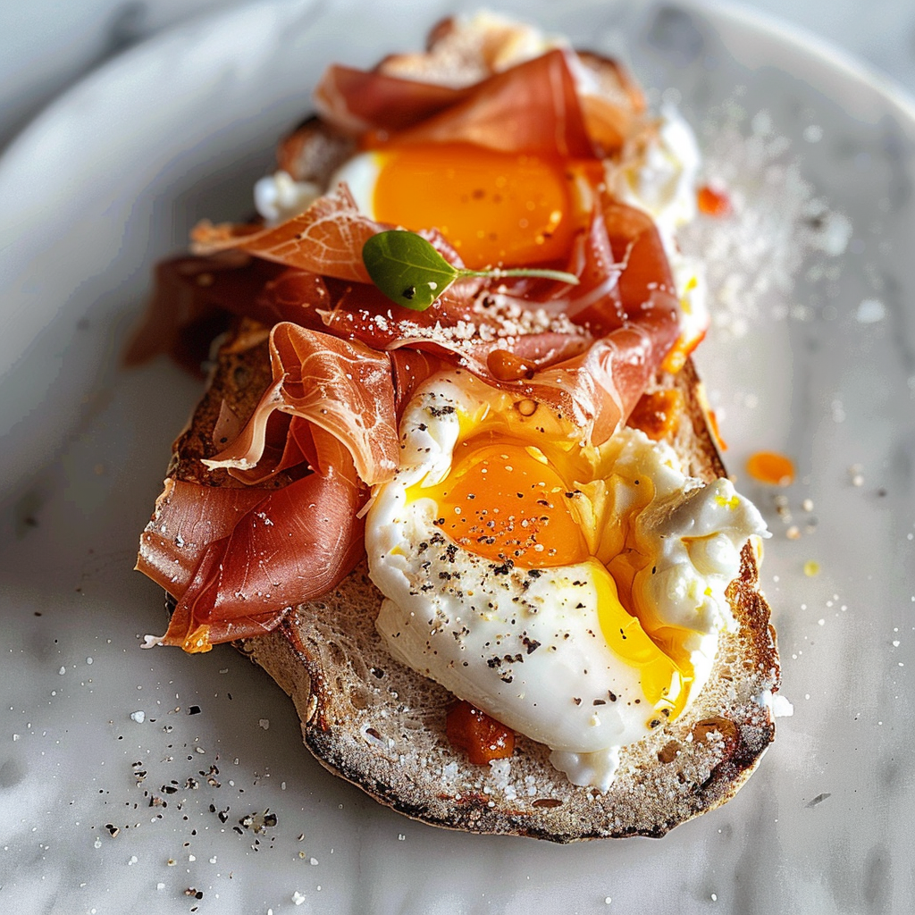 Fried Egg Yolk, Burrata and Prosciutto Toast is a luxurious brunch option that combines creamy burrata with crispy prosciutto on perfectly toasted artisan bread. Topped with a runny fried egg yolk, this dish promises an explosion of flavors and textures in every bite. Perfect for lazy weekends or elegant brunch gatherings, it’s sure to elevate your morning experience.